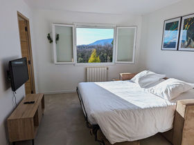Ce gîte est situé dans la bâtisse, une fois le portail passé, un escalier mène à la terrasse ombragée, une porte fenêtre s'ouvre sur la cuisine, un couloir dessert ensuite la salle d'eau, les WC, le séjour, puis une porte dessert la chambre .